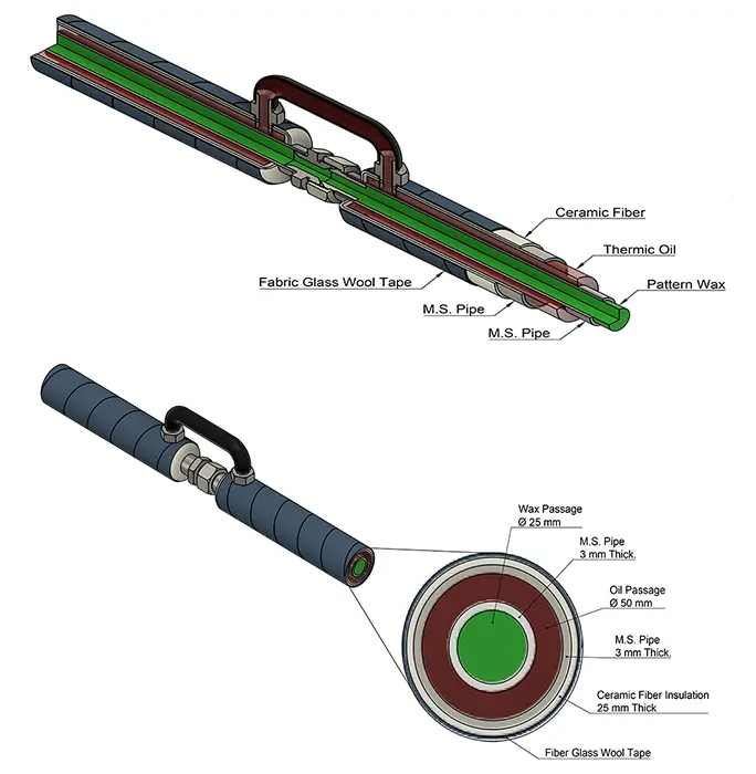 We provide a unique and customized automation of wax transfer by the insulated jacketed pipeline, which helps to transfer same temperature homogeneous past wax from one point to another point, it is a combination of 4 martials in sequence, small pipe for wax at center, another pips covers it and make gape between to pass the thermic oil, these both are insulated with ceramic fiber blanket, and finally wrapped with glass wool tape to make if fire proof.
