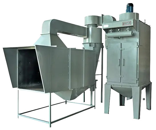 Sand blasting setup is a work station to clean the casted component, where work done more easy, heavy dust particle collected through cyclone separator and light dust particle collected by dust collector which prevent operator health.